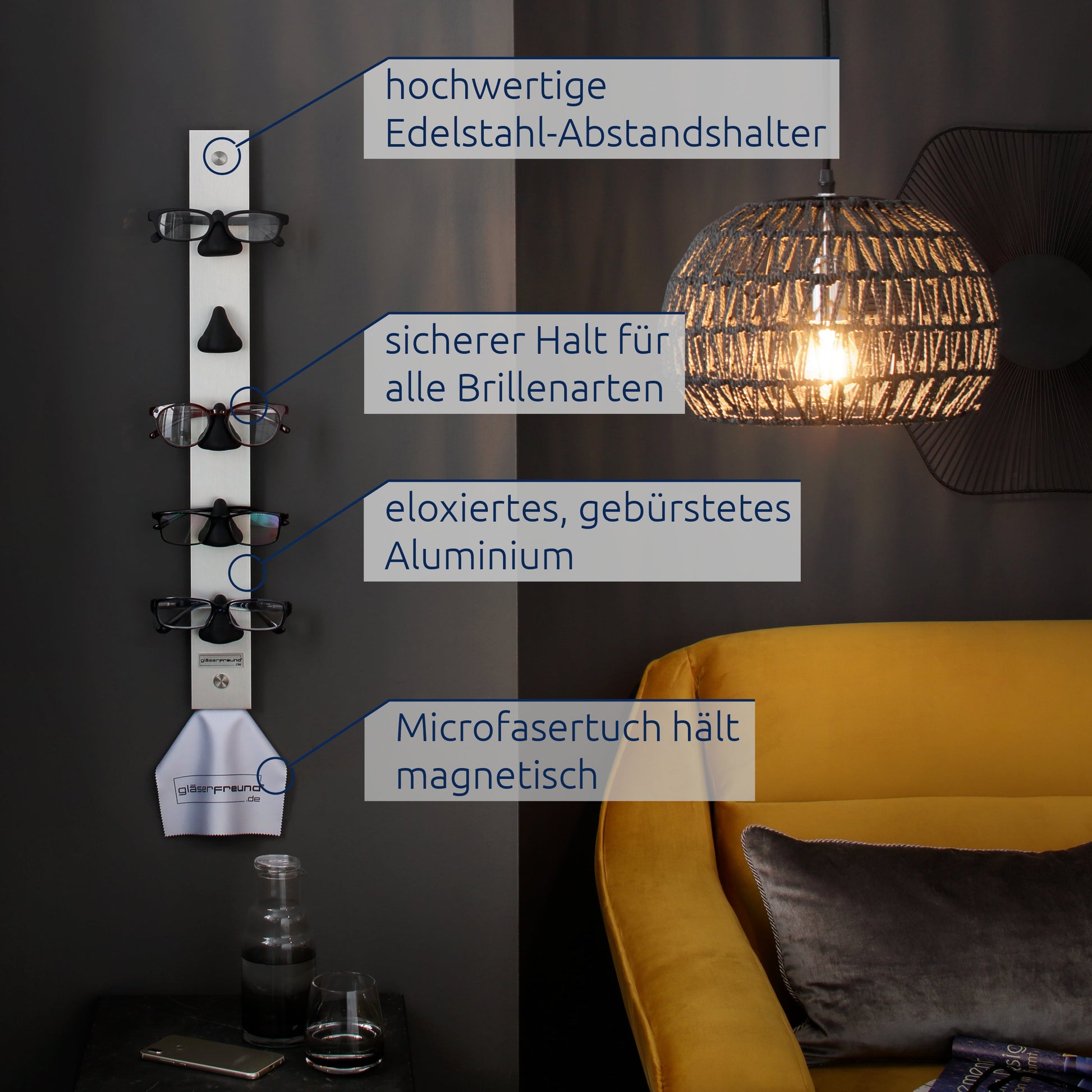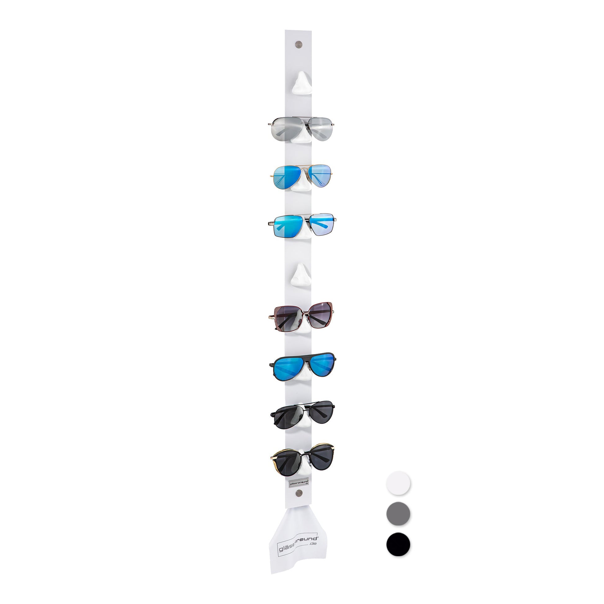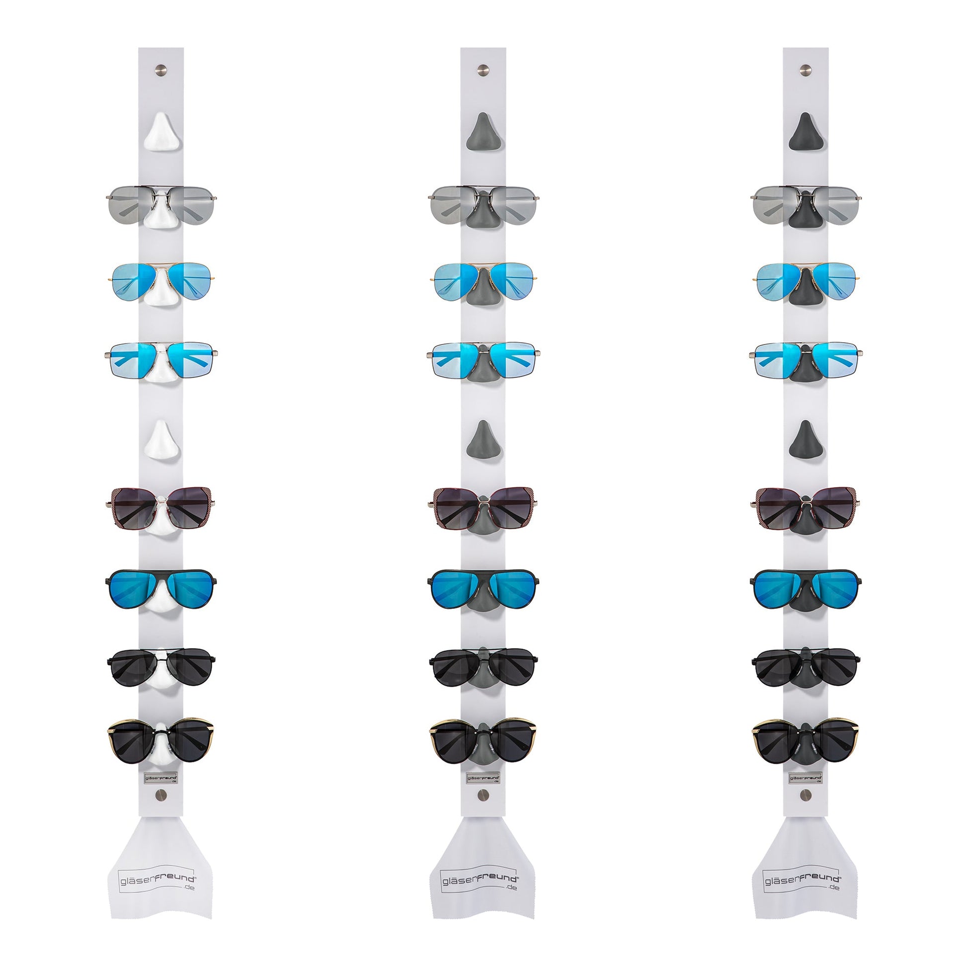 Brillenorganizer im White-Style. 9 Brillenhalterungen in Form von Nasen (magnetisch abnehmbar) auf einer matt weiss folierten Aluschiene montiert. Die mitgelieferten Distanzhalter (5 Stk.) können optional zwischen die abnehmbaren Halterungen gesteckt werden. So finden auch extrem gebogene Sport- oder Sonnenbrillen einen sicheren Halt. Made in Germany.